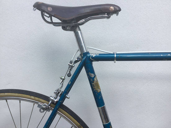Campagnolo Record chainset, front and rear derailleurs, shift levers, twin bolt seatpin and pedals, Mavic rims on Record large flange hubs, Fiamme stem and 3ttt bars, Universal Mod.61 brakeset, Brooks saddle.