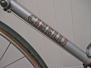 Silver with chrome lugs, fork crown and drop outs. TA Criterium chainset, Weinmann Vanquer 999 centrepull brakes with Universal levers, Campagnolo Record pedals, front mech, Gran Sport rear mech, Cinelli steel ‘Campione del Mondo’ mod. 16 bars on Cinelli steel badged stem, Mavic rims on Campag Record large flange hubs, Brooks Professional saddle on Campag Record twin bolt seatpin