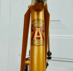 Repainted and re-equipped by Allins of Croydon in 1970s. Campagnolo Pista hubset, Mavic MA2 clincher rims, Cinelli 1A stem and CdM bars, Sakae Custom track chainset, Weinmann 605 brakeset, Brooks B17 Champion Narrow saddle on fluted alloy seatpin