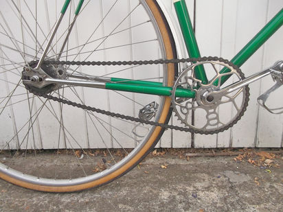 Green flam, White bands, Chrome ends, single fixedwheel, BSA cottered chainset and pedals, GB alloy bars on chrome Cinelli stem, Weinmann brakeset, Weinmann 27” alloy rims on Airlite L/F hubs, white Bluemels mudguards, Bristol swallow saddle on alloy seatpin