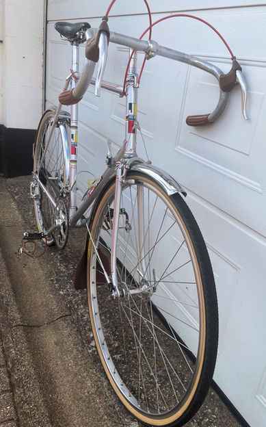 Restored condition frame equipped with Campagnolo Nuovo Record mechs, seatpost, crankset with SR rings and pista pedals. Suntour Power shifters, GB ‘Tour of Britain’ bars on GB stem, Mafac ‘Racer’ brakeset, Super Champion Competition clincher rims laced to early Campagnolo ‘Sports’ hubs, Brooks B5N saddle, Gilles Berthoud stainless steel mudguards.