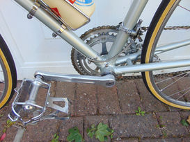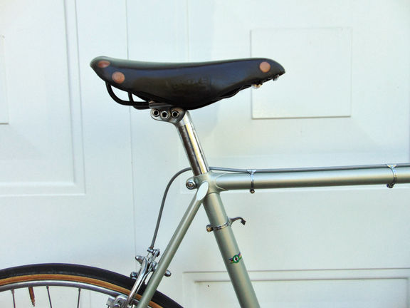 1st generation Campagnolo Record Strada crankset, headset, seat post, cable guides and shifters. 2nd generation pedals with Cornez toe clips and Alfredo Binda straps. Campagnolo Gran Sport derailleurs, 1st generation TA bottle cage, Ambrosio Champion alloy bars and stem, Universal Mod. 51 brakeset, Campagnolo branded FB small flange hubs fitted with Campagnolo quick release levers and laced with Nisi sprint rims. Brooks B17 saddle modified by Giuseppe Ottussi, Regina 5 speed block and Regina Record chain.