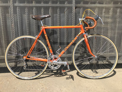Restored frame equipped with Simplex LJ1000 rear mech, Prestige Criterium front mech and shifters, Stronglight mod.105 crankset, Mafac Racer brakeset, Mavic Module E rims on Pelissier hubs, Spidel pedals, San Marco Rolls saddle, SR bars and stem.