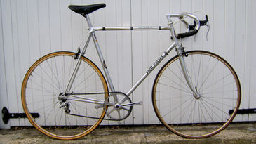 It is still fitted with the original equipment, the lightest available at that time and weighs an incredible 17 lbs. Chainset: TA Criterium single. Brake levers: Mafac composite bodied with drilled levers. Brake Calipers: Weinmann 500 side pulls. Saddle: Cinelli unpadded Unicanitor. Seatpin: Ruggieri fluted. Mech: Suntour Cyclone. Block: Suntour Gold 5 speed close ratio 13-17. Chain: Regina 'Record slotted'. Bars: Cinelli 'Criterium'. Stem: Cinelli 1A 100mm. Headset: EDCO 'Competition'. Wheels: Mavic gold ORO10 sprint rims on Omas small flange hubs. These wheels were built by TdeF mechanic Ken Bird. Front, radially spoked. Rear, crossed, tied and soldered drive side.