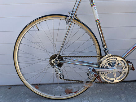 The 1972 all Chrome example with Nervex Pro Lugset and Prugnat BB shell that I have acquired is mostly original with a complete and original Campy Nouvo Record groupset, Record LF hubs with Fiamme rims, Cinelli Giro D'Italie bars and old logo stem. It has a newer Brooks Professional saddle on the original seat post, Vittoria Rally tubular tires and Gipiemme track pedals.