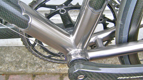 Built for Chris Boardman. Superlight carbon and titanium constructed frame, Campagnolo Carbon Record 10 speed group set with Campag Hyperon carbon wheels. In it’s day, the most expensive frameset on the market