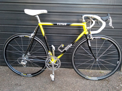 Frame in original factory paint finish.Campagnolo Centaur brakes/shifters and derailleurs, Record chainset & bottom bracket, Chorus 10 spd cassetteCinelli bars & stem, Mavic (Vitus branded) headset, Look Delta pedals, Turbo Saddle, Ambrosio Focus 16 flat spoke wheelset, KMC X10 Chain, Elite bottle cage, Fizik gloss bar tape, Michelin Dynamic Sport 700x25 tyres